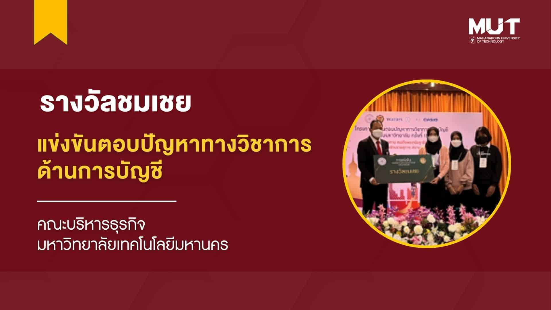 สมาคมสถาบันอุดมศึกษาเอกชนแห่งประเทศไทย (สสอท.) ได้จัดโครงการแข่งขันตอบปัญหาทางวิชาการด้านการบัญชีระดับมหาวิทยาลัยครั้งที่ 15 ชิงถ้วยพระราชทานสมเด็จพระกนิษฐาธิราชเจ้า กรมสมเด็จพระเทพรัตนราชสุดาฯสยามบรมราชกุมารี ณ มหาวิทยาลัยธนบุรี เมื่อวันที่ 22 กรกฎาคม 2565 โดยมีมหาวิทยาลัยเอกชนเข้าร่วม 17 สถาบัน รวม 33 ทีม วัตถุประสงค์ของการจัดการแข่งขัน เพื่อส่งเสริมให้นักศึกษามีความกระตือรือร้นในการเรียนหลักสูตรบัญชี และส่งเสริมให้มีทัศนคติที่ดีต่อวิชาชีพบัญชี พร้อมเชื่อมความสัมพันธ์ระหว่างสถาบันเอกชนทั่วประเทศ ทั้งนี้ มหาวิทยาลัยเทคโนโลยีมหานคร สามารถคว้ามาได้ 1 รางวัล คือ รางวัลชมเชย ได้แก่ นางสาวอติกานต์ เหมศิริ นางสาวสุนทรี สลามเต๊ะ และนางสาวเมรณี ทองมา