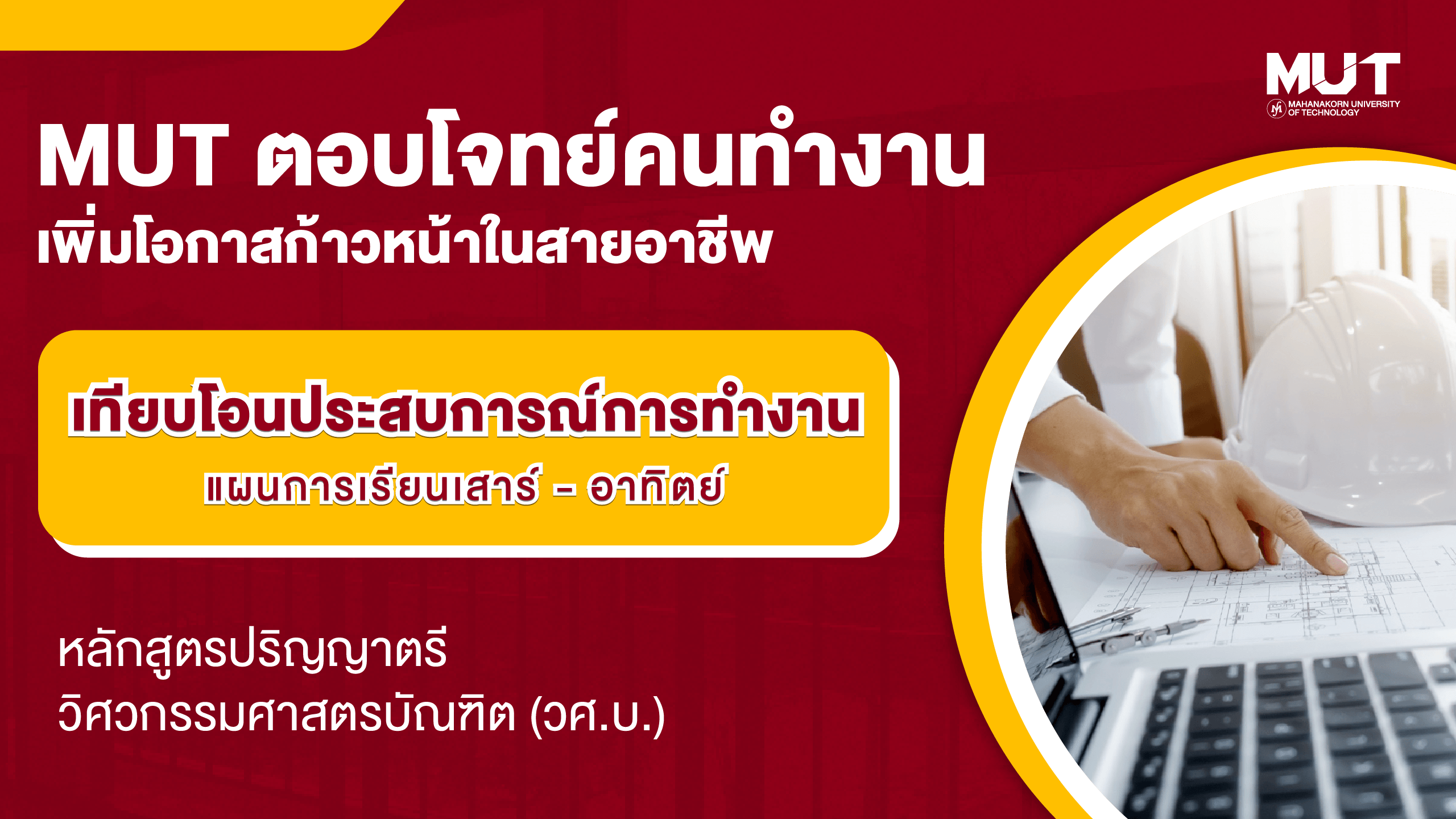 มหาวิทยาลัยเทคโนโลยีมหานคร (MUT) เปิดแผนการเรียนวิศวะเสาร์-อาทิตย์ หลักสูตรปริญญาตรี วิศวกรรมศาสตรบัณฑิต (วศ.บ.) เทียบโอนวิศวะจากประสบการณ์การทำงาน มาเป็นหน่วยกิต เพื่อเพิ่มโอกาสก้าวหน้าในสายอาชีพสำหรับคนทำงาน สร้างโอกาสทางการศึกษาที่มากกว่า สามารถจัดสรรช่วงเวลาเรียนที่เหมาะสมได้ ทำให้สามารถเรียนและทำงานคู่ขนานกันได้ นอกจากนี้ยังสามารถแบ่งชำระค่าเทอมได้ ช่วยลดค่าใช้จ่ายและลดข้อจำกัดของนักศึกษาได้เป็นอย่างดี