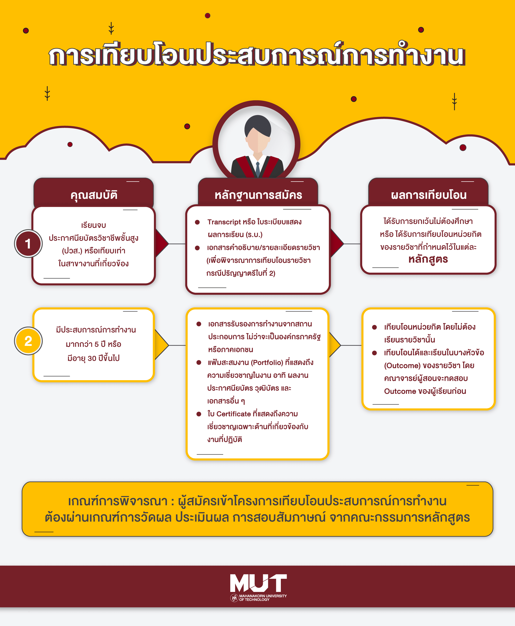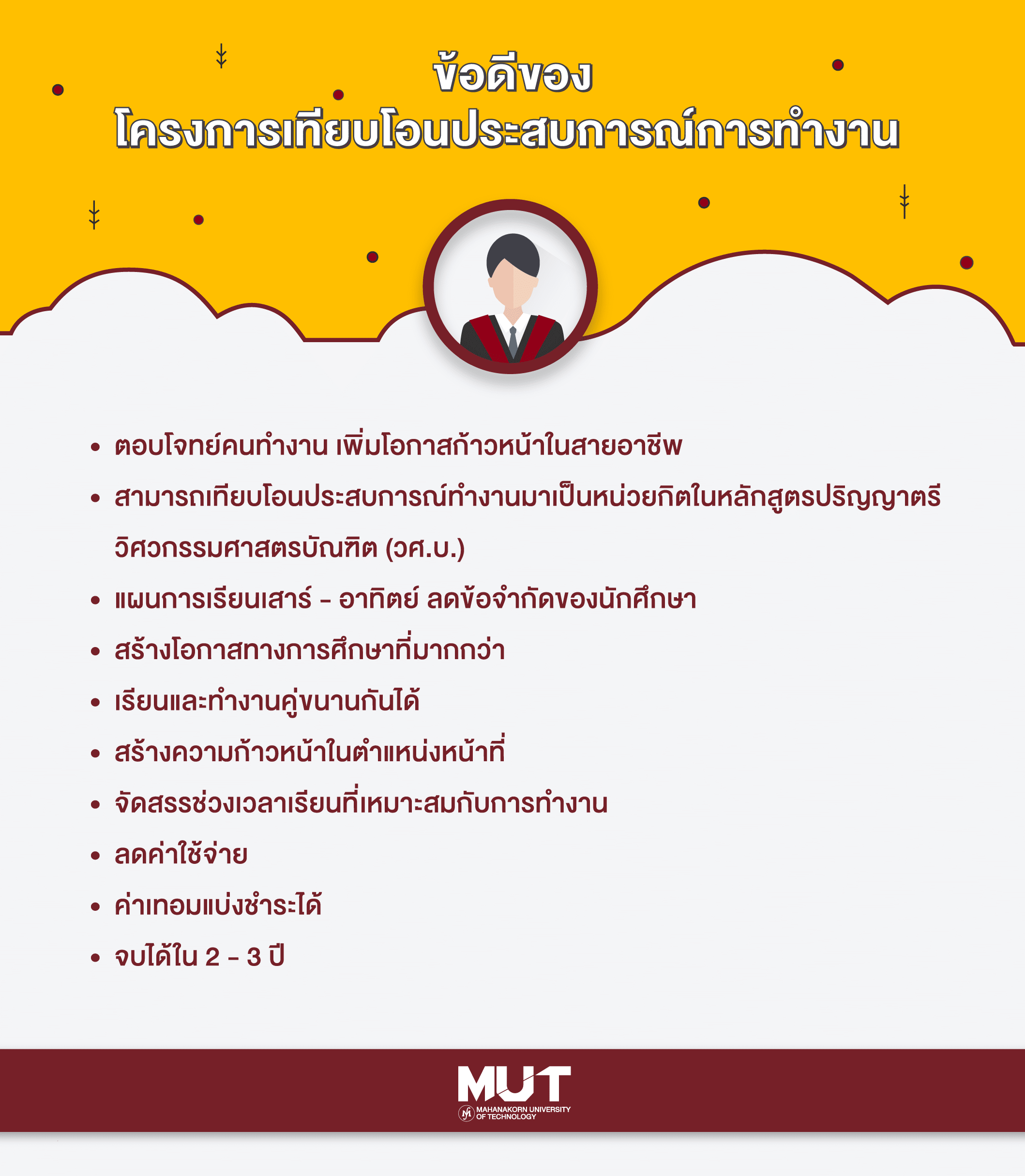 เพื่อผลักดันให้ผู้ที่มีวุฒิ ปวส. หรือเทียบเท่า และผู้ที่มีประสบการณ์การทำงานในสายงานที่เกี่ยวข้อง ได้มีโอกาสในการศึกษาเพื่อต่อยอดความรู้ในสายอาชีพได้มากขึ้น MUT จึงได้เปิดรับสมัครนักศึกษาหลักสูตรวิศวกรรมศาสตร์ในโครงการเทียบโอนประสบการณ์การทำงาน แผนการเรียนวิศวะเสาร์-อาทิตย์ เพื่อให้ผู้ที่มีความสนใจสามารถเรียนรู้คู่ขนาดไปกับการทำงานได้อย่างมีประสิทธิภาพ โดยสามารถยื่นสมัครได้ 2 วิธีคือ การเทียบโอนหน่วยกิต และการเทียบโอนประสบการณ์การทำงาน