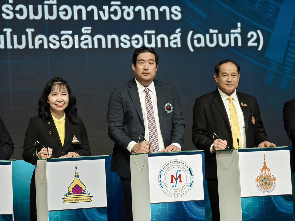 การลงนามบันทึกความร่วมมือทางวิชาการด้านไมโครอิเล็กทรอนิกส์ ระหว่าง กระทรวงการอุดมศึกษา วิทยาศาสตร์ วิจัยและนวัตกรรม โดย สำนักงานการวิจัยแห่งชาติ (วช.) และ 10 สถาบันอุดมศึกษา เพื่อเพิ่มขีดความสามารถในการแข่งขันทางอุตสาหกรรมด้านไมโครอิเล็กทรอนิกส์ในระดับนานาชาติ โดยมี รศ. ดร. ภานวีย์ โภไคยอุดม อธิการบดีมหาวิทยาลัยเทคโนโลยีมหานคร (MUT) เข้าร่วมในพิธีลงนามนี้